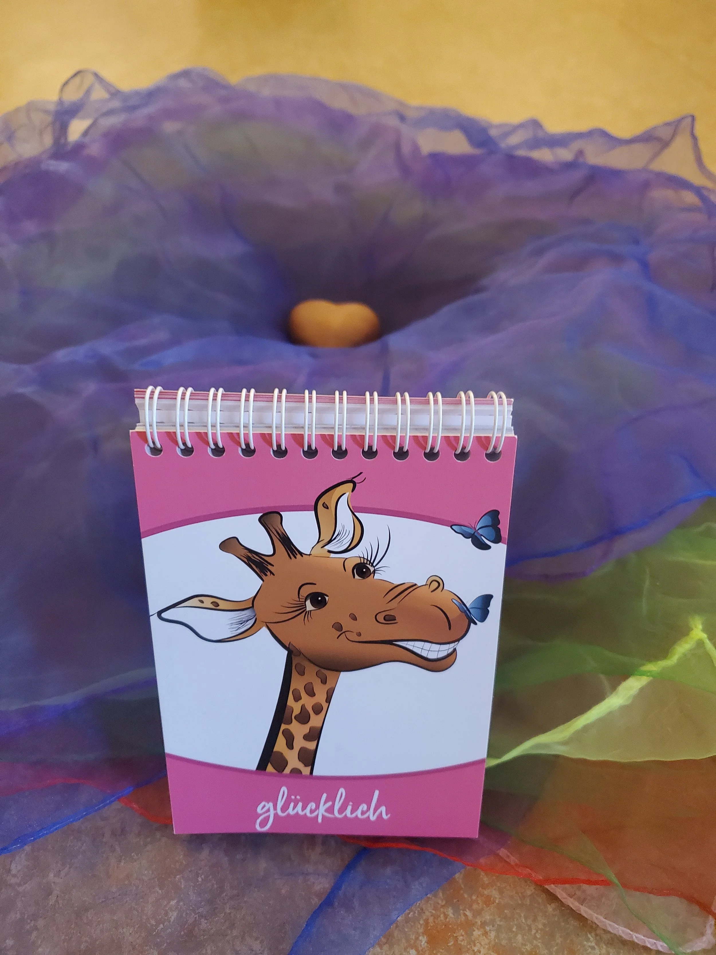 Der lachende Kopf einer Giraffe, die sich über den Besuch zweier blauer zarter Schmetterlinge an ihrer Nase freut. Das Bild ist mit dem Wort “glücklich” untersetzt.