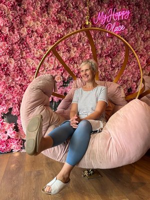 Das Foto zeigt mich auf einem weißen Stuhl im Garten meines Arbeitsumfeldes. Ende September 2024, Foto von Heike Blauwitz-Kröber, Arnstadt.